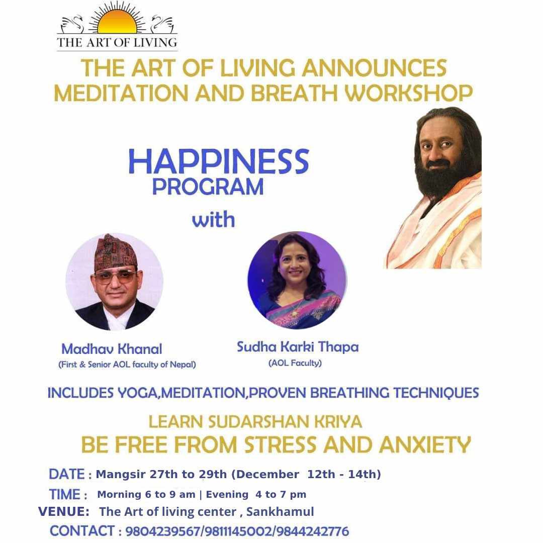 Art of Living Center, Shankhamul*Happiness Program* With *Madhav Khanal & Sudha Karki Thapa* *Get the secrets to manage your mind, Stress and emotions with simple Breathing Techniques and Meditation!* 🌎 Learn the world-renowned *Sudarshan Kriya*🌎 🗓 *Date* :*December 12th to 14th , Mangsir 27th to 29th)* *Thrusday to Saturday* ⏰️ 6:00 - 9:00 AM Morning 4:00 - 7:00 PM […]